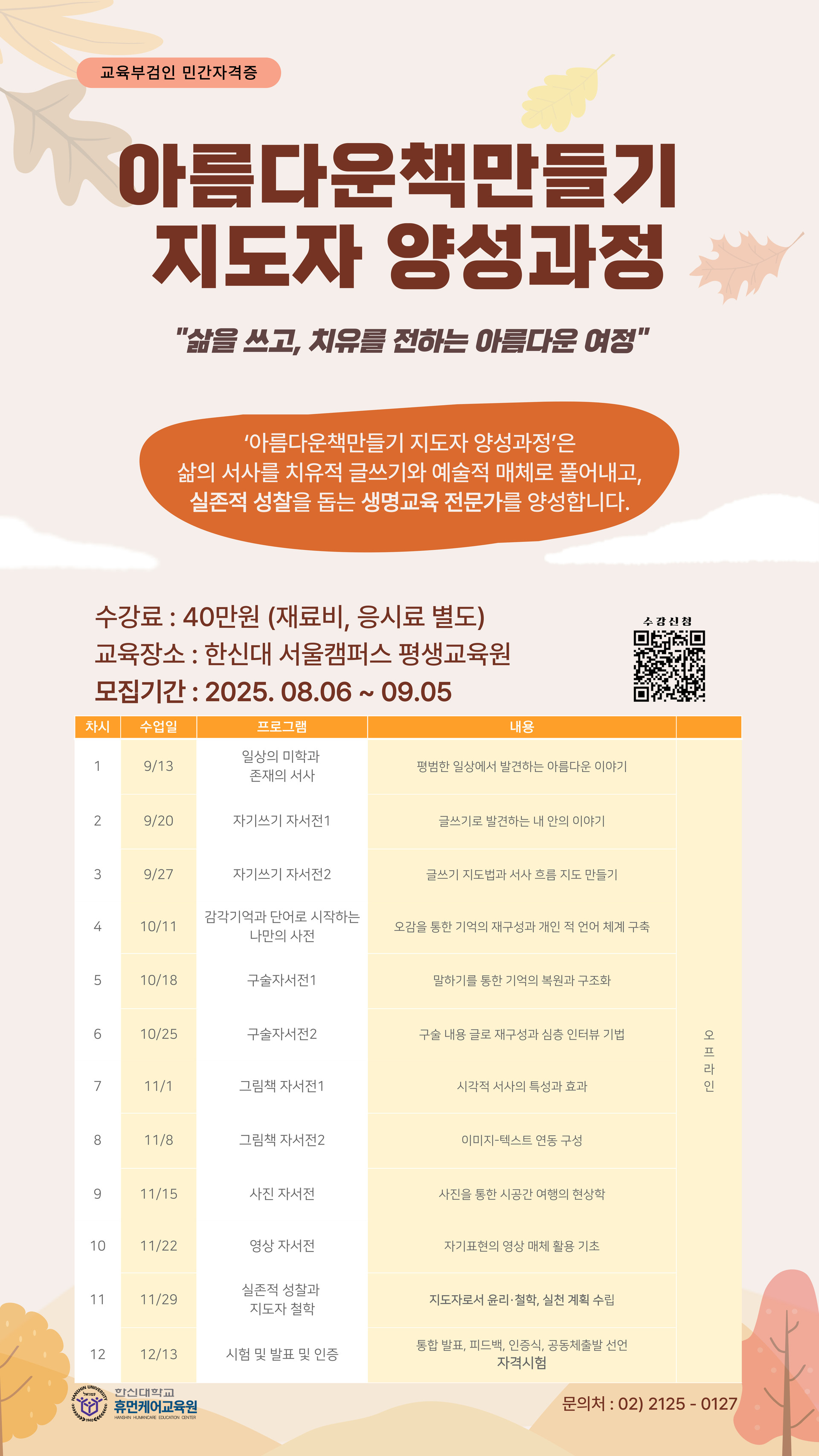 신청방법: 한신대학교 휴먼케어교육원 홈페이지에서 온라인으로 신청 가능합니다.